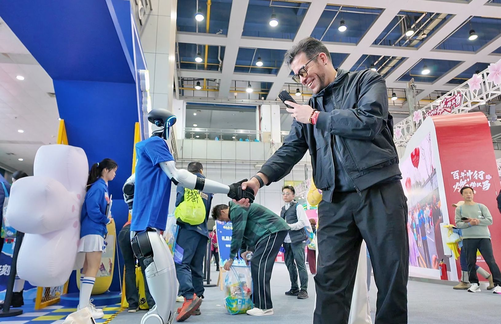 3月20日,在武漢國(guó)際會(huì)展中心,2025武漢馬拉松迎來(lái)了首個(gè)參賽選手報(bào)到領(lǐng)物日。委內(nèi)瑞拉選手吳瑞龍看見(jiàn)人形機(jī)器人志愿者,開(kāi)心地上前與它握手。