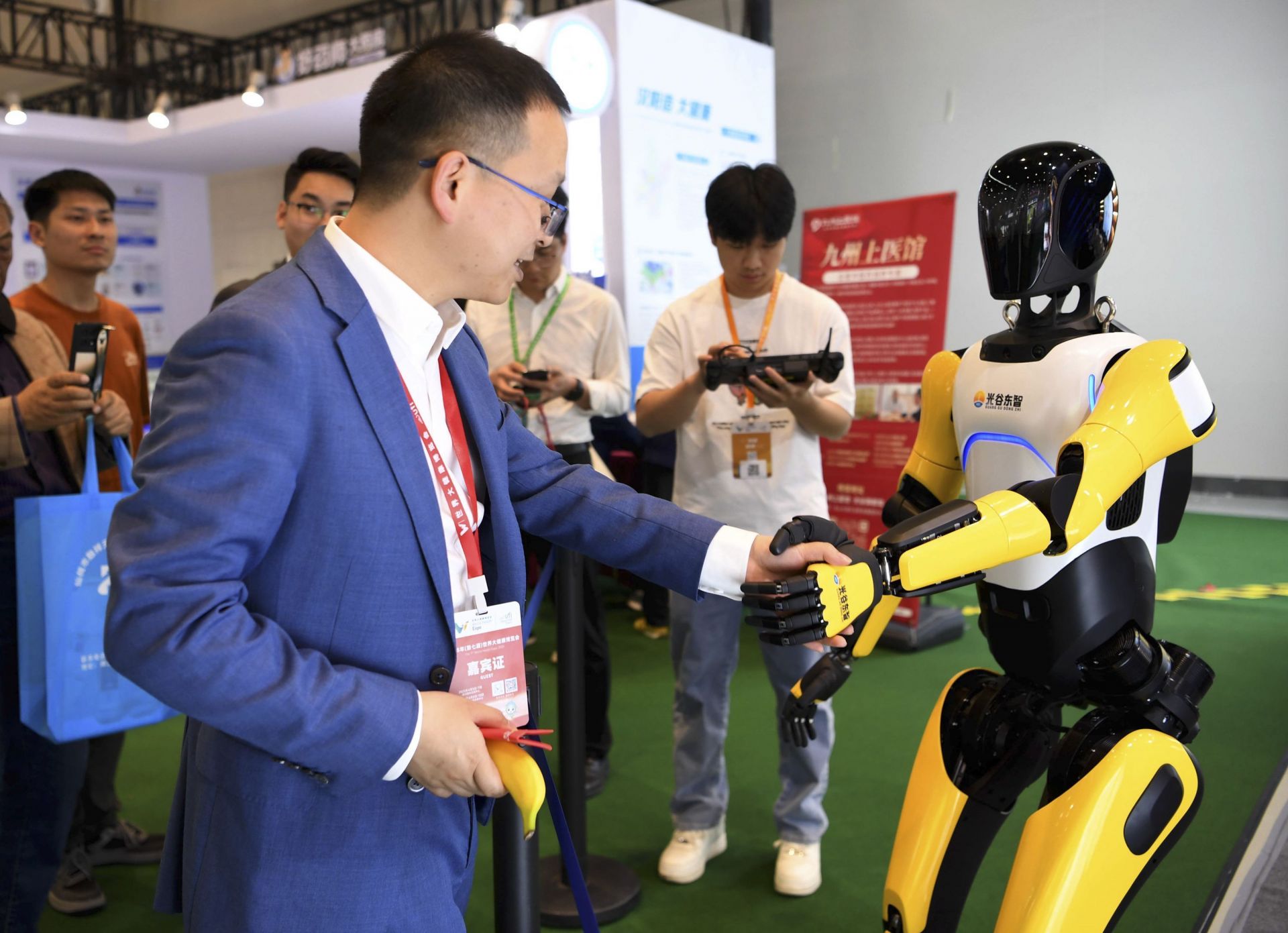 光谷東智科技展示的A2智能機(jī)器人吸引了大家的目光,不少觀眾與它握手互動(dòng)。4月8日,2025年第七屆世界大健康博覽會(huì)上,智能機(jī)器人紛紛登臺(tái)。