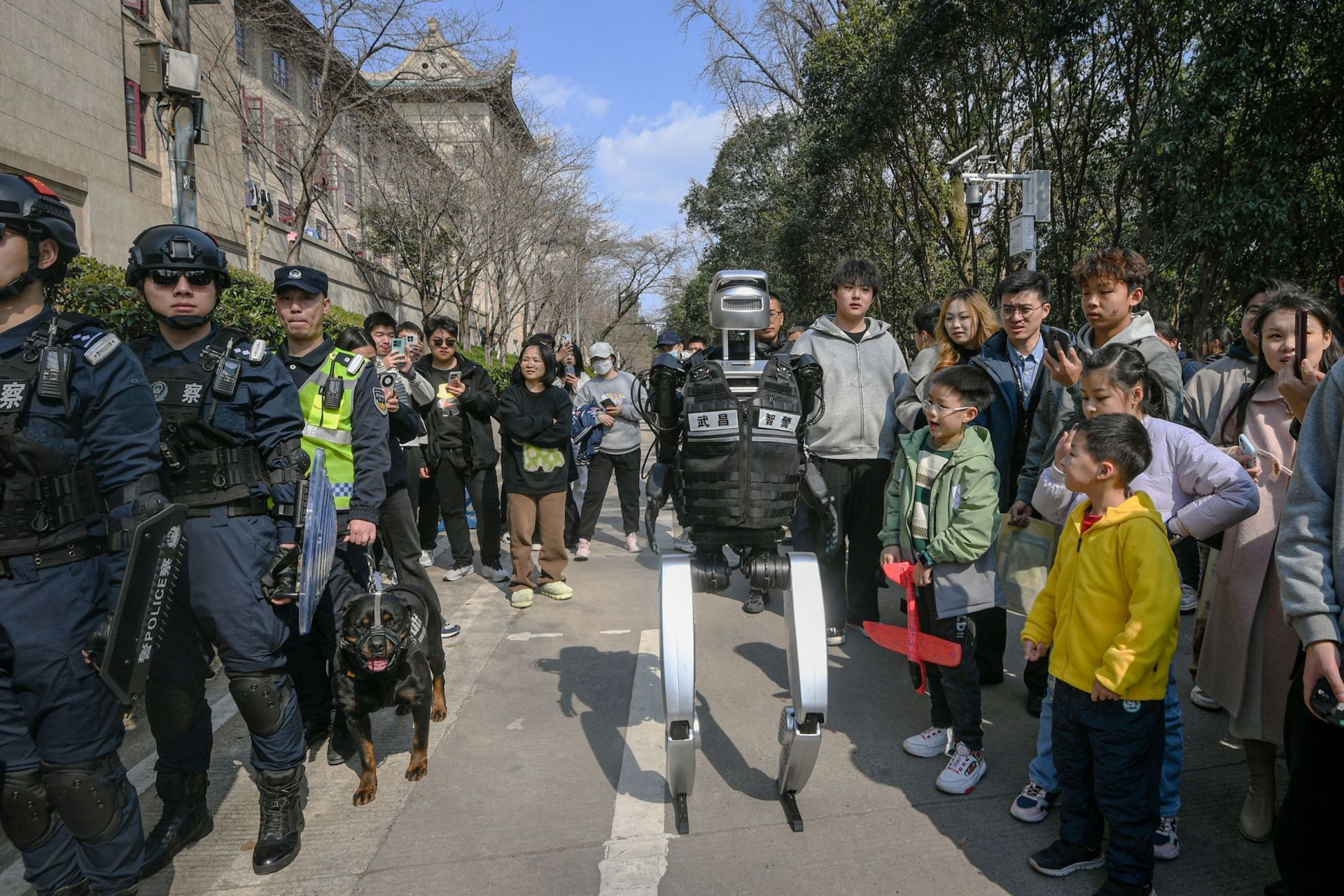 3月16日,武漢大學(xué)櫻花大道上,一臺(tái)身著黑色馬甲的人形機(jī)器人“智警小珞”穿梭在賞櫻人群中。