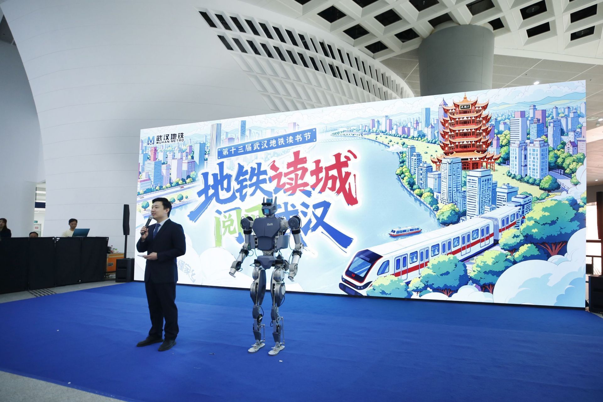 4月10日,第十三屆武漢地鐵讀書(shū)節(jié)活動(dòng)在光谷廣場(chǎng)環(huán)形站廳拉開(kāi)帷幕,由華中科技大學(xué)陳學(xué)東院士團(tuán)隊(duì)與武漢格藍(lán)若共同研制,擁有出色負(fù)載能力的湖北明星機(jī)器人“勞動(dòng)者3號(hào)”登上主舞臺(tái),擔(dān)任活動(dòng)嘉賓主持。