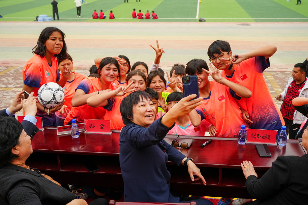 ↑4月12日,在2025新疆克孜勒蘇柯?tīng)柨俗巫灾沃葑闱蚵?lián)賽開(kāi)幕式后,中國(guó)足協(xié)副主席、前中國(guó)國(guó)家女子足球隊(duì)球員孫雯(前)與阿圖什市U13女子足球隊(duì)合影。新華社記者 徐宏巖 攝