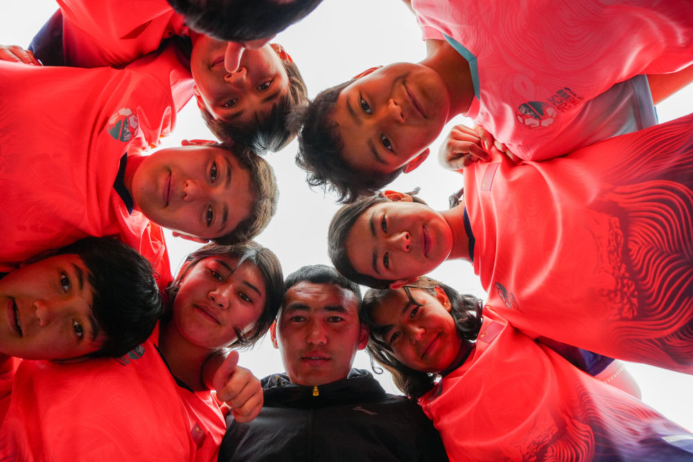 ↑4月12日,阿圖什市U13女子足球隊(duì)教練如扎吉(下中)和隊(duì)員在一場(chǎng)友誼賽前合影。新華社記者 徐宏巖 攝