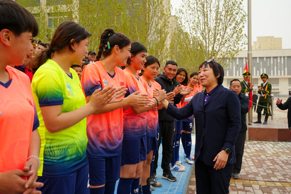 ↑4月12日,2025新疆克孜勒蘇柯?tīng)柨俗巫灾沃葑闱蚵?lián)賽開(kāi)幕式后,中國(guó)足協(xié)副主席、前中國(guó)國(guó)家女子足球隊(duì)球員孫雯(前右一)與阿圖什市U13女子足球隊(duì)隊(duì)員阿依謝·托乎達(dá)洪(左三)交流。新華社記者 徐宏巖 攝