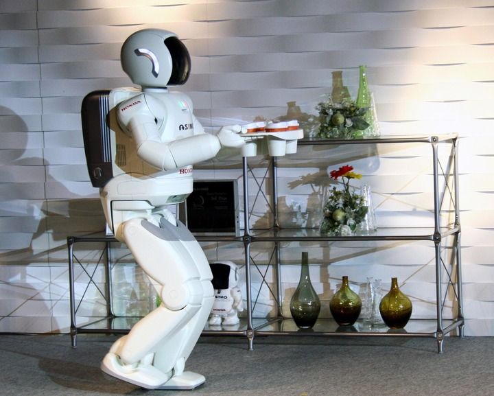 本世紀初,日本本田公司發(fā)布一款酷似太空宇航員的人形機器人ASIMO(阿西莫),能上下樓梯,聽懂語音指令。2013年美國波士頓動力公司發(fā)布的人形機器人Atlas在跑步機上健步如飛,還能跳躍、旋轉(zhuǎn)、翻滾等,它為災(zāi)難現(xiàn)場而設(shè)計,目標是在化學(xué)泄漏、建筑倒塌等危險區(qū)域替代人類完成開關(guān)閥門、搬運等任務(wù)。