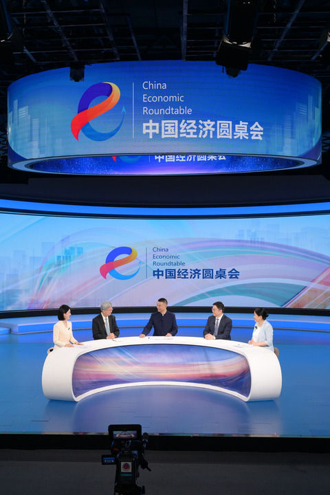 嘉賓們?cè)诘谑迤凇爸袊?jīng)濟(jì)圓桌會(huì)”大型全媒體訪談節(jié)目錄制現(xiàn)場交流發(fā)言。新華社記者 李賀 攝