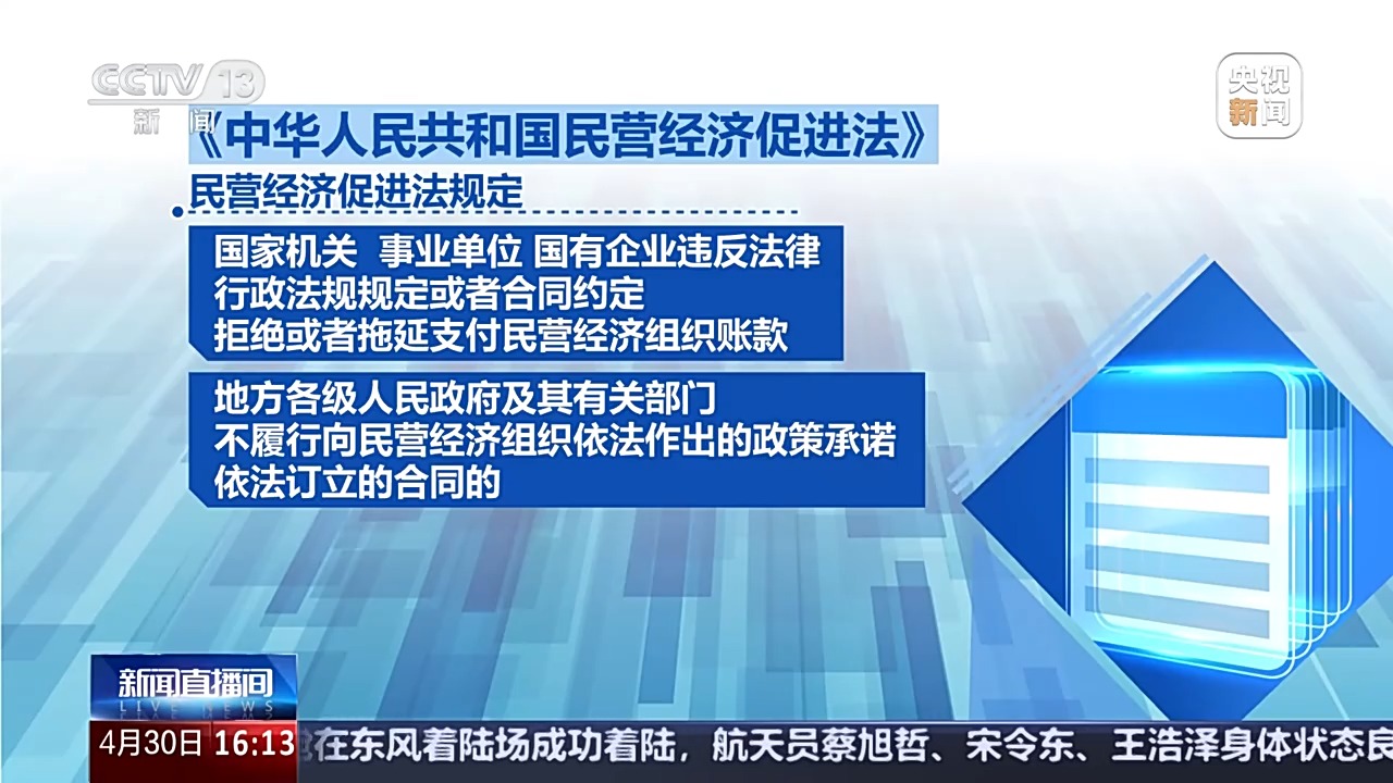 另外,民營經(jīng)濟促進法規(guī)定,國家機關、事業(yè)單位、國有企業(yè)違反法律、行政法規(guī)規(guī)定或者合同約定,拒絕或者拖延支付民營經(jīng)濟組織賬款,地方各級人民政府及其有關部門不履行向民營經(jīng)濟組織依法作出的政策承諾、依法訂立的合同的,由有權機關予以糾正,造成損失的,依法予以賠償;造成不良后果或者影響的,對負有責任的領導人員和直接責任人員依法給予處分。
