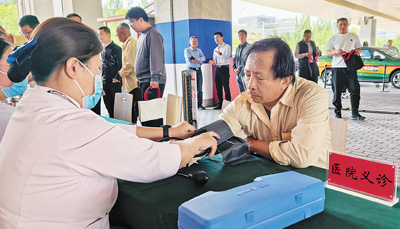 “您這血壓有點高,‘五一’假期活多,別忘了吃藥?!薄坝涀±玻x謝。”51歲的司機楊建民在門口的義診攤位量完血壓,整理著衣袖。