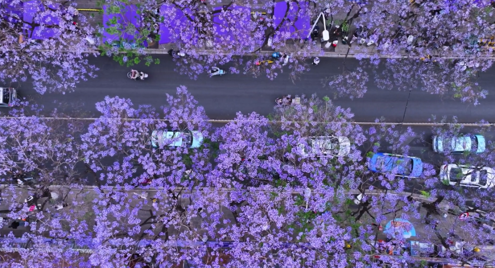 “五一”假期,昆明市教場(chǎng)中路延綿的紫色花海盛開。