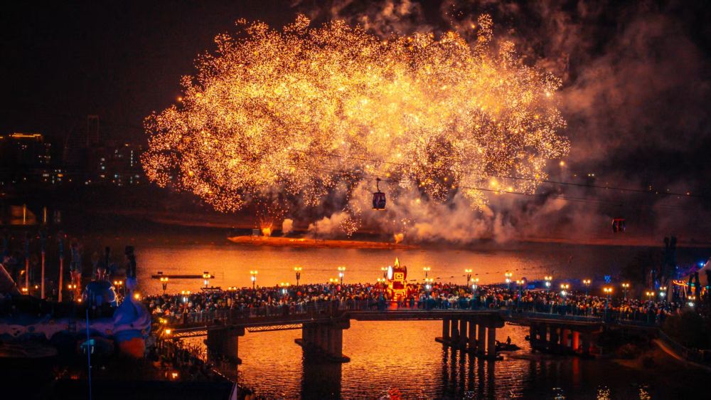 5月1日晚,游客在上海海昌海洋公園觀賞煙花秀。(上海海昌海洋公園供圖)