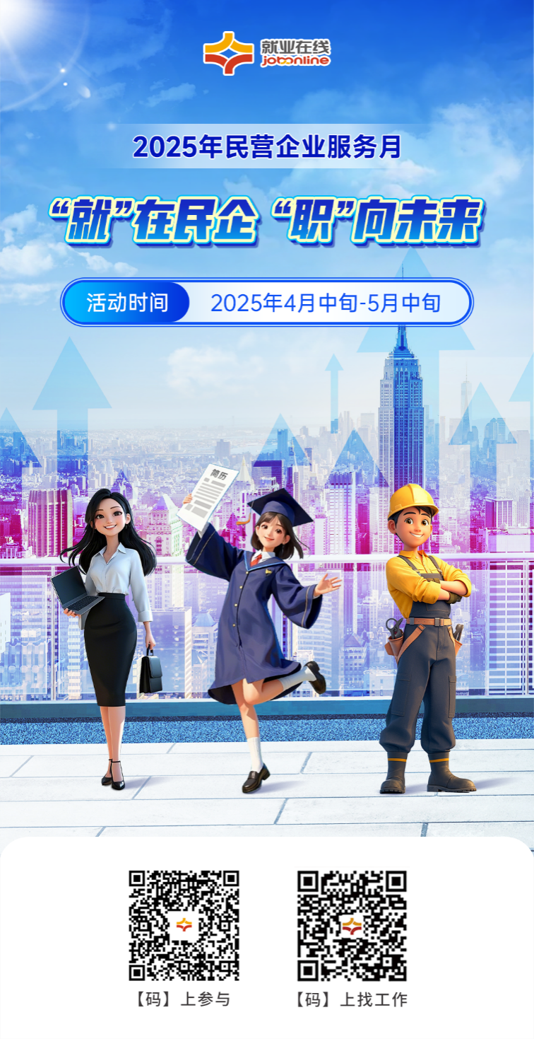 為支持民營(yíng)經(jīng)濟(jì)發(fā)展,促進(jìn)高質(zhì)量充分就業(yè),按照人力資源社會(huì)保障部等6部門(mén)關(guān)于開(kāi)展2025年民營(yíng)企業(yè)服務(wù)月活動(dòng)安排,“就業(yè)在線”平臺(tái)開(kāi)展2025年民營(yíng)企業(yè)服務(wù)月線上招聘求職服務(wù)活動(dòng),助力民營(yíng)企業(yè)招聘用工和廣大勞動(dòng)者求職就業(yè)。