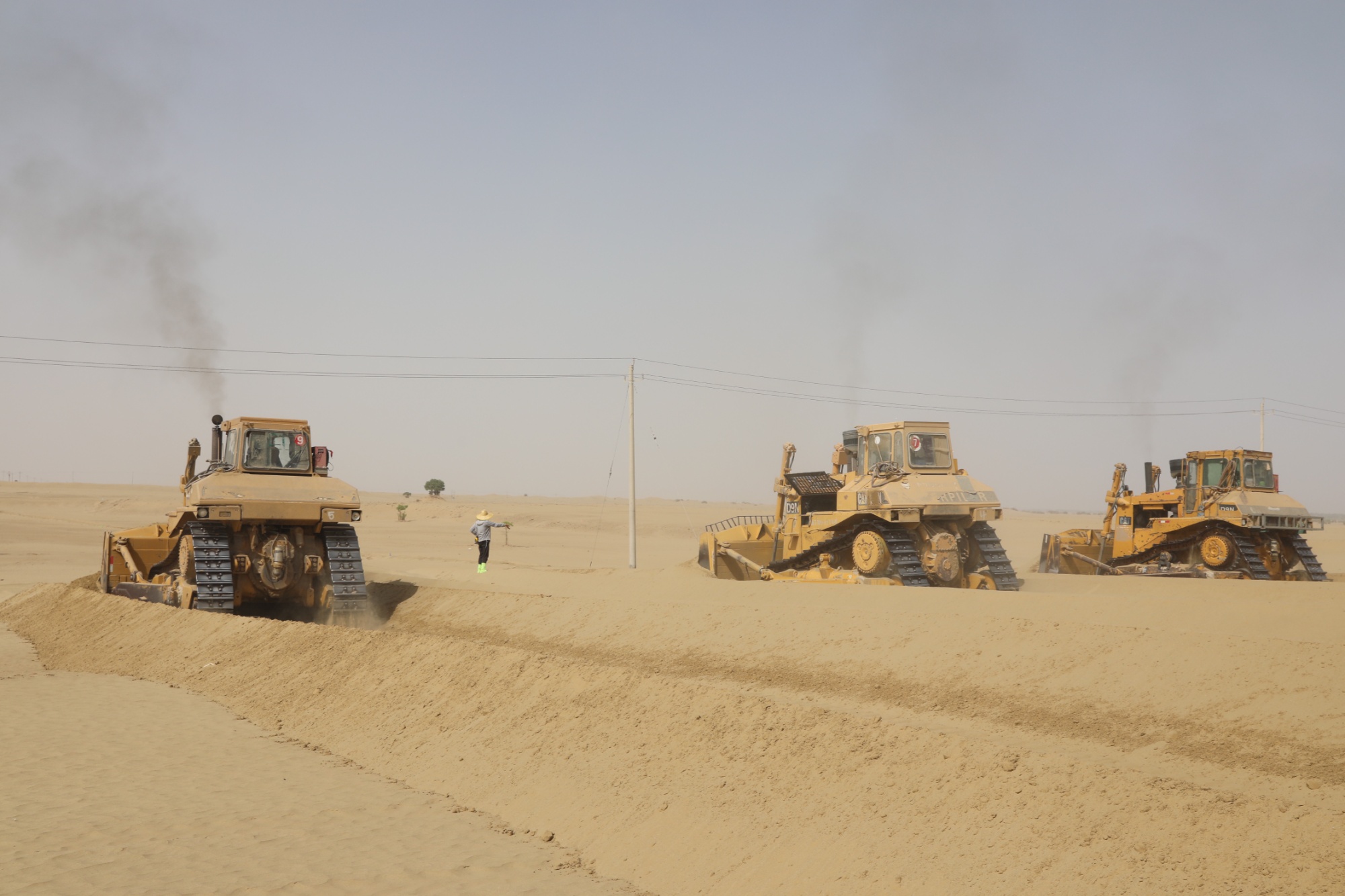 防沙治沙項(xiàng)目現(xiàn)場(chǎng),大型機(jī)械正在平整沙漠 (日孜完古麗·買(mǎi)吐地 攝)