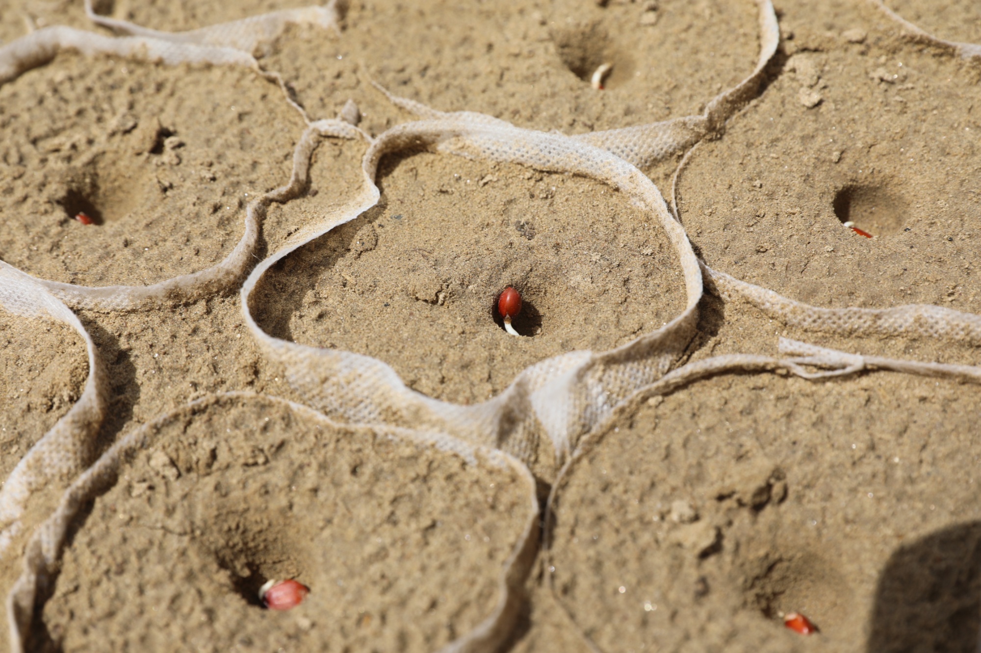 播種前,土地經(jīng)過(guò)改良,混合化肥與羊糞的有機(jī)肥料被均勻撒入沙土,再裝入育苗袋。在育苗袋里播種后,工作人員澆水、埋土、覆膜、搭建拱棚,確保幼苗在防風(fēng)保溫的環(huán)境中茁壯成長(zhǎng)。