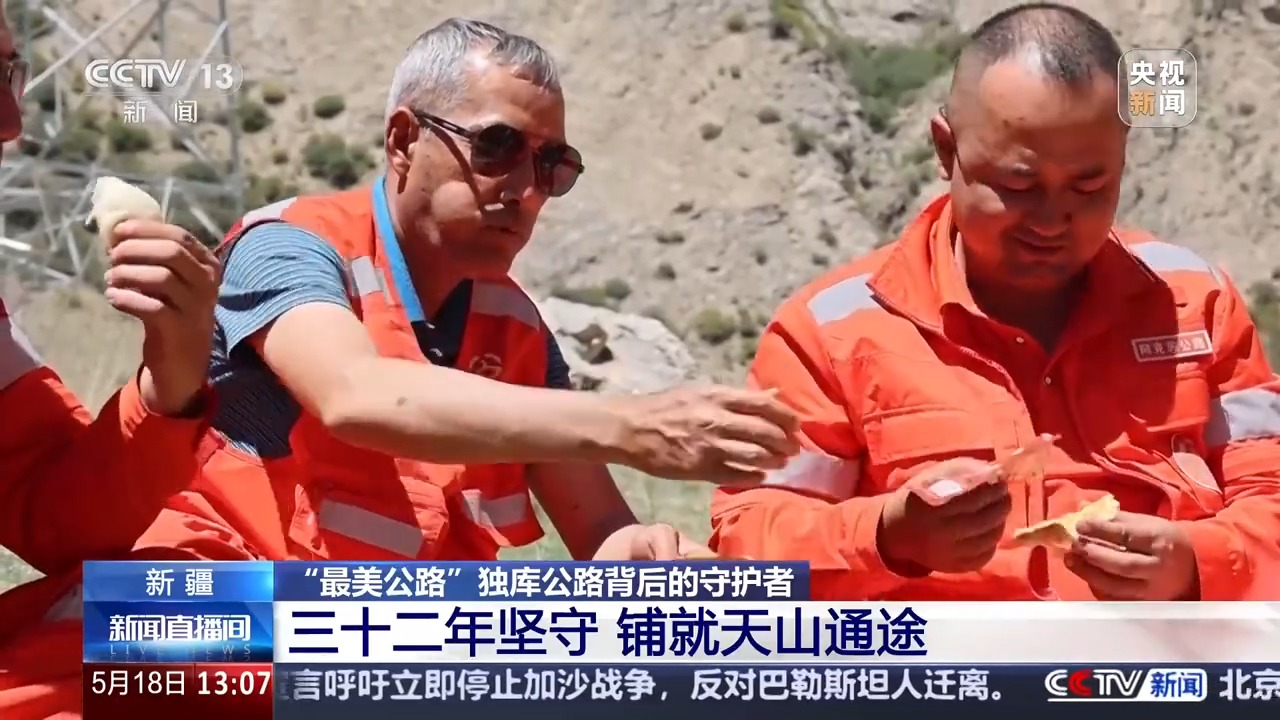 下午兩點(diǎn)多,亞克甫招呼大家停下來(lái)吃午飯。這幾天,亞克甫和同事們要搶在獨(dú)庫(kù)公路通車(chē)之前,把冰封了一個(gè)冬天的道路養(yǎng)護(hù)好。他們經(jīng)常沒(méi)時(shí)間回到養(yǎng)護(hù)站休整,午飯也只能在路邊對(duì)付一下。