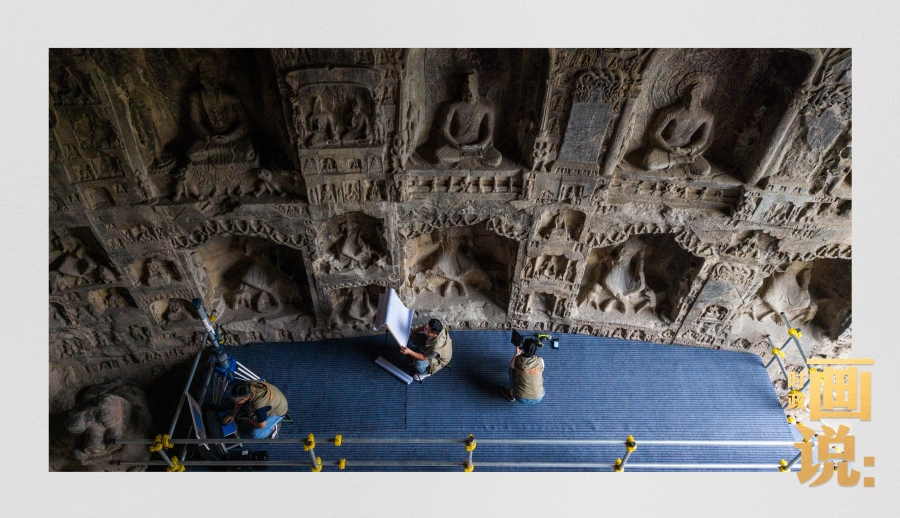 龍門石窟研究院工作人員在古陽(yáng)洞使用關(guān)節(jié)臂掃描儀對(duì)佛像進(jìn)行數(shù)字化掃描