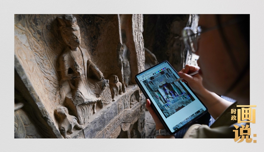 工作人員在對(duì)石刻病害情況進(jìn)行詳細(xì)記錄