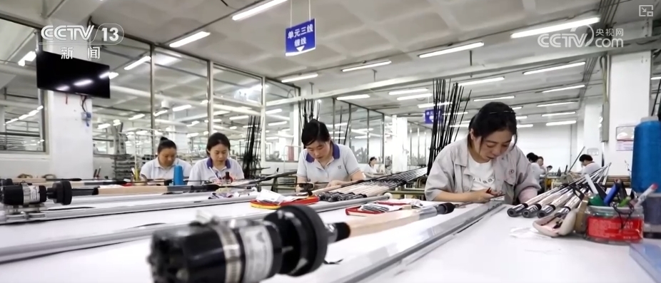 山東威海的釣具早已蜚聲海外,這里聚集了近5000家釣具生產(chǎn)及貿(mào)易企業(yè),包攬了全球六成魚竿市場份額。在這家規(guī)模較大的生產(chǎn)企業(yè)里,碳纖維魚竿從自動流水線魚貫而下,即將發(fā)往歐洲市場。2025年以來,企業(yè)出口額達2.1億元,同比增長27%。