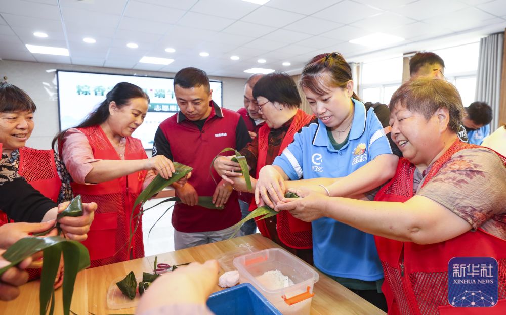 5月23日,江蘇省淮安經(jīng)濟(jì)技術(shù)開發(fā)區(qū)的退休職工志愿者和快遞員一起包粽子。新華社發(fā)(趙啟瑞攝)