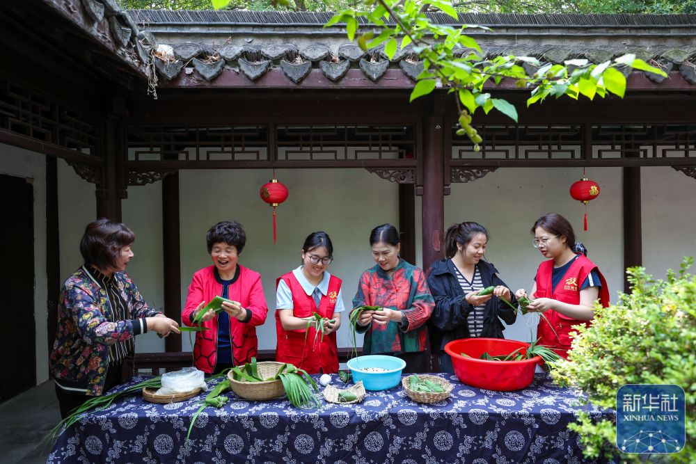 5月24日,在位于江蘇省興化市昭陽(yáng)街道的興化書院,青年志愿者和社區(qū)居民一起包粽子。新華社發(fā)(周社根攝)