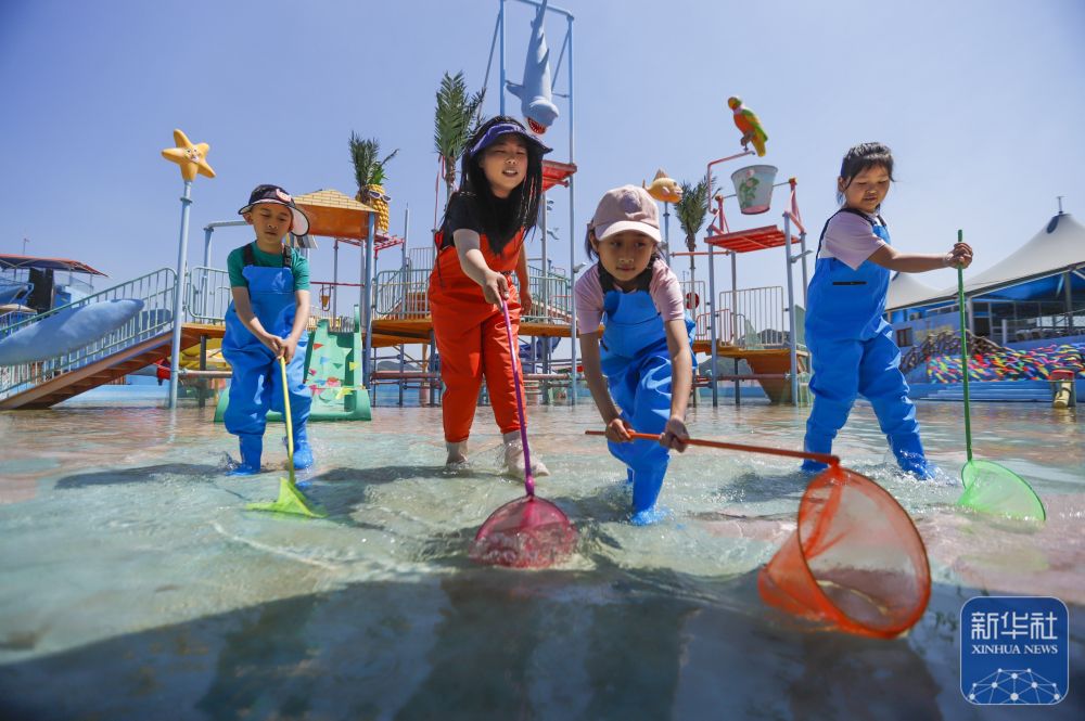 5月24日,游客在河北省遵化市南山常樂谷景區(qū)水世界參加親子撈魚活動(dòng)。新華社發(fā)(劉滿倉(cāng)攝)