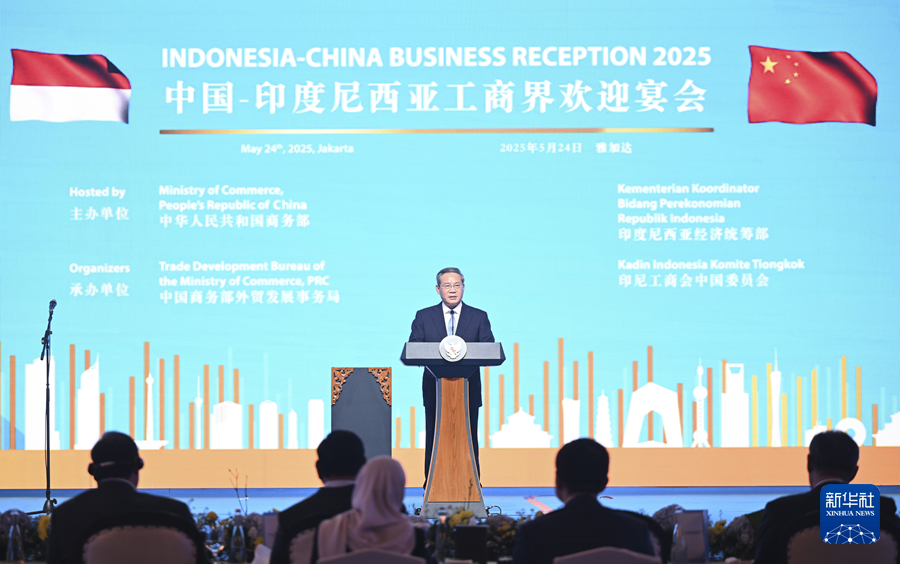 當?shù)貢r間5月24日晚,國務院總理李強在雅加達同印度尼西亞總統(tǒng)普拉博沃共同出席中國-印尼工商界晚宴并致辭。新華社記者 李響 攝