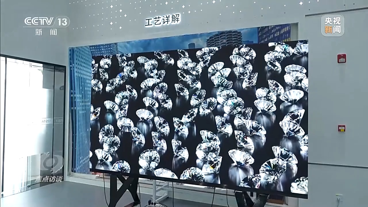 維信諾Micro-LED技術(shù)負(fù)責(zé)人、成都辰顯光電有限公司總經(jīng)理 黃秀頎:這款產(chǎn)品歷經(jīng)了8年的研發(fā)時間,到現(xiàn)在推出全球最新的135英寸TFT基Micro-LED(顯示屏)。它的特點,亮度非常高,而且色彩非常細(xì)膩,還原度很高。但是這塊屏是拼接出來的,上面總共有2400萬顆LED發(fā)光點,大的135英寸里面有200片屏,每個屏還要把它組裝成箱體,這里有25個箱體。可以根據(jù)客戶的需求定制大小,只要把箱體拼上去就可以無限擴(kuò)展,現(xiàn)在拼縫控制的是幾十個微米量級,大概就是頭發(fā)絲直徑的五分之一。