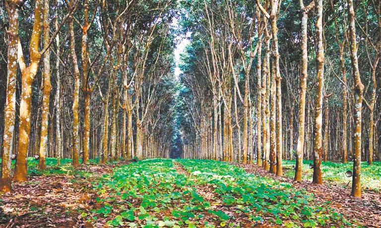 在距離西雙版納傣族自治州景洪市環(huán)城北路約1公里處,記者見到云南省熱帶作物科學(xué)研究所占地1054畝的環(huán)境友好型生態(tài)膠園千畝試驗(yàn)示范基地。這里將橡膠樹種植行距從傳統(tǒng)8米擴(kuò)大到20米以上,在橡膠樹間套種上述經(jīng)濟(jì)作物。如此布局,即使橡膠行情不好,經(jīng)過精心篩選套種的其他經(jīng)濟(jì)作物也能取得不錯(cuò)的經(jīng)濟(jì)效益。