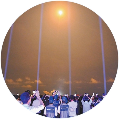 “5,4,3,2,1”——火箭的火焰照亮夜幕,平臺(tái)的光束射向天際……19時(shí)50分,火箭發(fā)射升空,游客們舉著手機(jī)記錄,現(xiàn)場歡呼聲陣陣?!昂芘d奮、很震撼,感覺一伸手就能‘抓’到火箭。”延鈺菲說。
