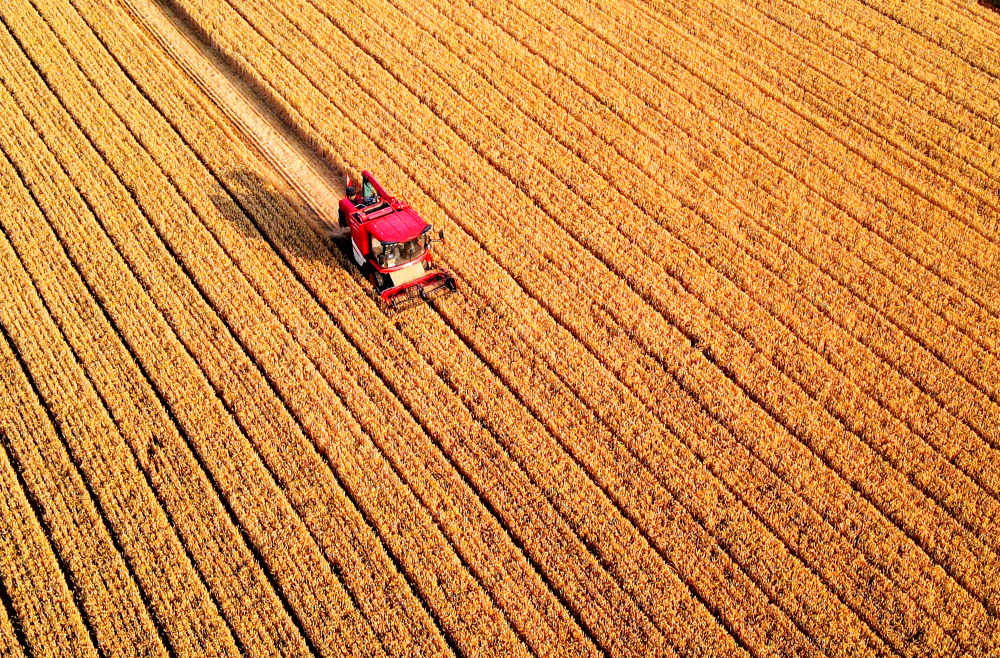 麥田金黃,農(nóng)機(jī)手收割正酣,一排排小麥被整齊地切割、脫?!瓘V袤農(nóng)田一片繁忙景象。