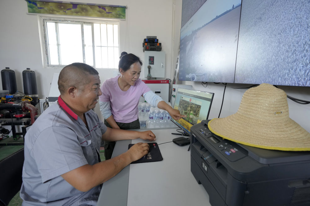 在山西省運(yùn)城市鹽湖區(qū)解州鎮(zhèn)曲村,董會(huì)龍(左)和妻子范月親通過(guò)農(nóng)機(jī)精準(zhǔn)作業(yè)平臺(tái)查看農(nóng)機(jī)手作業(yè)情況。董會(huì)龍夫妻是運(yùn)城市鹽湖區(qū)解州鎮(zhèn)的種糧大戶(hù)。(5月27日攝)。