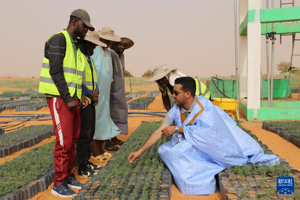 5月22日,在毛里塔尼亞西部特拉扎區(qū)比爾·巴爾卡村,中非綠色技術公園毛里塔尼亞示范項目毛方協調員圖拉德·邁杜向工人傳授固沙植物種植技術。新華社記者 司源 攝