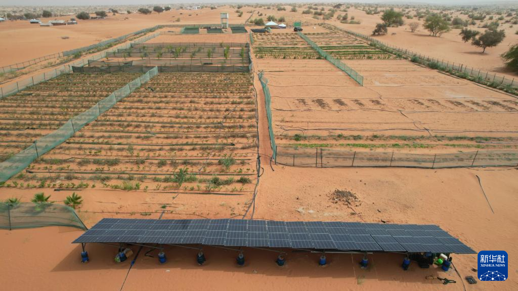 頭頂驕陽,腳踩熱沙,在毛里塔尼亞西部特拉扎區(qū)比爾·巴爾卡村沙地上,一排排滴灌管線沿著整齊壟溝延伸,嫩綠的果蔬苗從黃色沙土中破土而出。一旁的太陽能板正源源不斷將光能轉化為電力,驅動水泵將地下水送至田間。放眼望去,昔日寸草不生的荒漠,如今分區(qū)布設、綠意漸起,一幅沙漠變綠洲的畫卷正悄然展開。