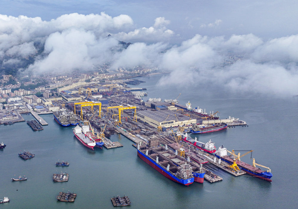 5月8日拍攝的山東省榮成市石島管理區(qū)修造船產(chǎn)業(yè)基地船塢(無(wú)人機(jī)照片)。新華社發(fā)(李信君攝)