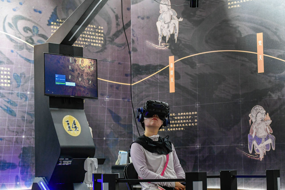 2024年7月22日,游客借助VR設(shè)備沉浸式游覽莫高窟第285窟虛擬場景。新華社記者 郎兵兵 攝