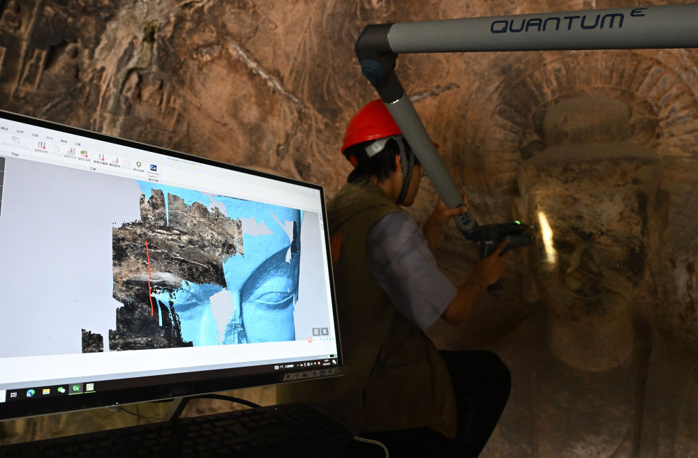 4月9日,武漢大學(xué)文化遺產(chǎn)智能計算實(shí)驗室團(tuán)隊成員在龍門石窟魏字洞使用關(guān)節(jié)臂掃描儀對佛像進(jìn)行數(shù)字化掃描。新華社記者 李嘉南 攝