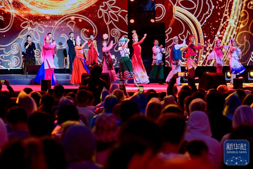 中國(guó)文聯(lián)文藝志愿服務(wù)團(tuán)隊(duì)“送歡樂(lè)下基層”文藝演出在新疆伊犁哈薩克自治州霍城縣香水體育公園舉行(6月14日攝)。