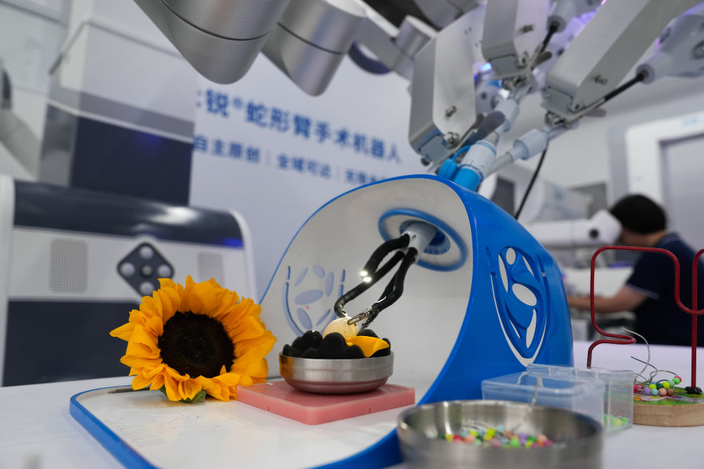 6月18日,工作人員在使用術(shù)銳蛇形臂手術(shù)機(jī)器人進(jìn)行剝生鵪鶉蛋殼展示。新華社記者鄭煥松 攝
