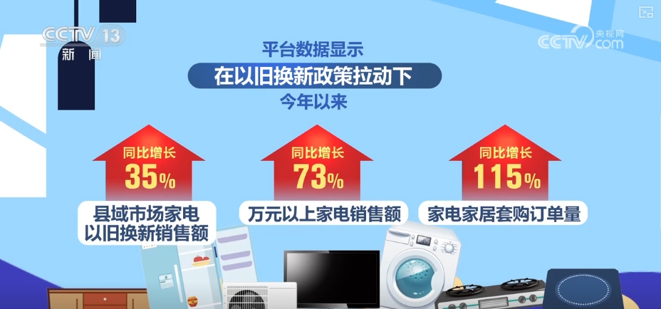 平臺(tái)數(shù)據(jù)顯示,在“以舊換新”政策拉動(dòng)下,2025年以來,縣域市場(chǎng)家電“以舊換新”銷售額同比增長(zhǎng)35%,萬元以上家電銷售額同比增長(zhǎng)73%,家電家居套購(gòu)訂單量同比增長(zhǎng)115%。