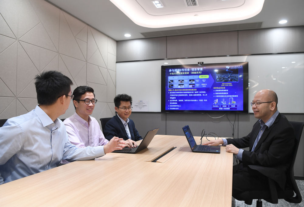 6月19日,香港太空機(jī)械人與能源中心聯(lián)合主任于宏宇教授(右二)在實(shí)驗(yàn)室與團(tuán)隊(duì)成員交流。新華社記者 陳鐸 攝