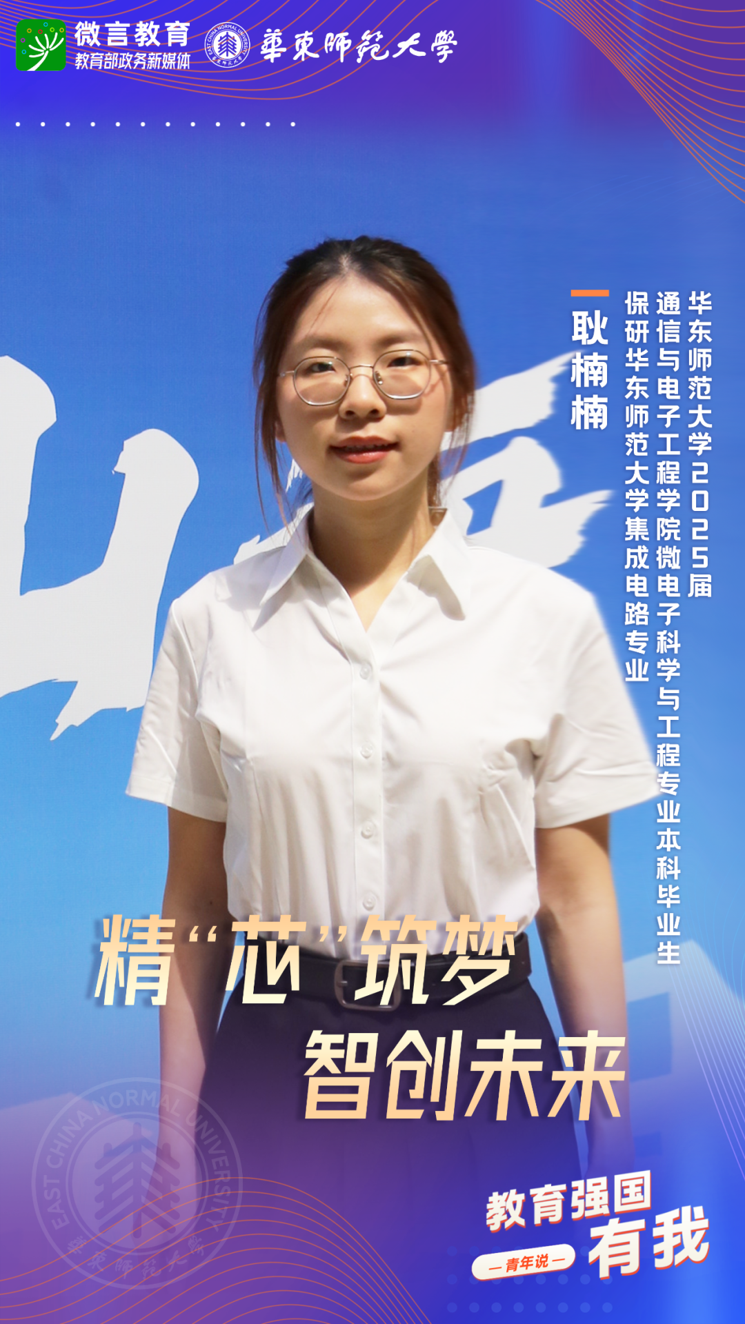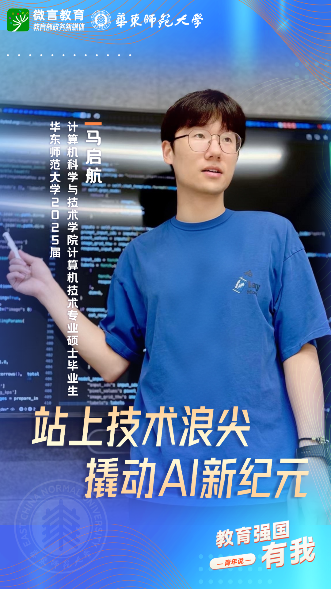 習(xí)近平總書記強(qiáng)調(diào),希望廣大青年堅定理想信念,厚植家國情懷,練就過硬本領(lǐng),發(fā)揚(yáng)奮斗精神,到祖國和人民最需要的地方發(fā)光發(fā)熱,為中國式現(xiàn)代化建設(shè)貢獻(xiàn)青春力量。教育強(qiáng)國建設(shè),青年何為?教育部政務(wù)新媒體推出“教育強(qiáng)國,有我!”網(wǎng)絡(luò)主題宣傳活動之“青年說(報國篇)”系列,展現(xiàn)青年學(xué)子將個人理想融入國家發(fā)展的青春擔(dān)當(dāng)。今天,跟教育小微通過1個視頻和1組海報,一起來看華東師范大學(xué)學(xué)子如何“向新而行”——