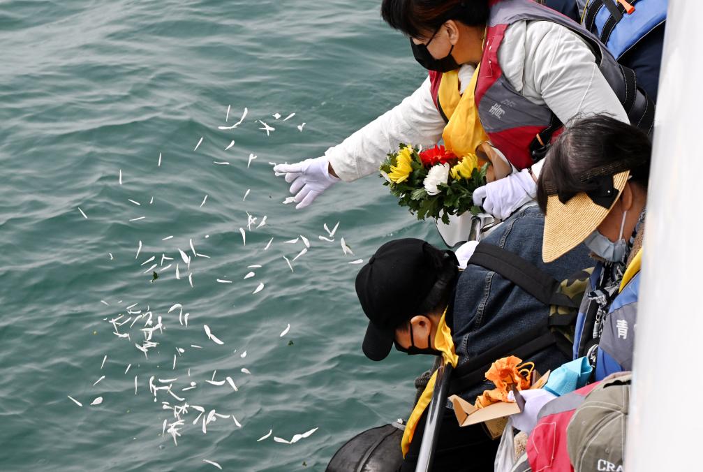 2024年3月28日,山東青島眾多生態(tài)海葬逝者的親屬乘船出海參加海上追思活動。新華社記者 李紫恒 攝