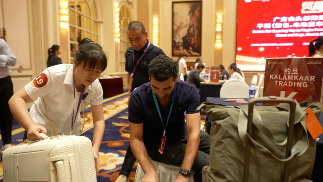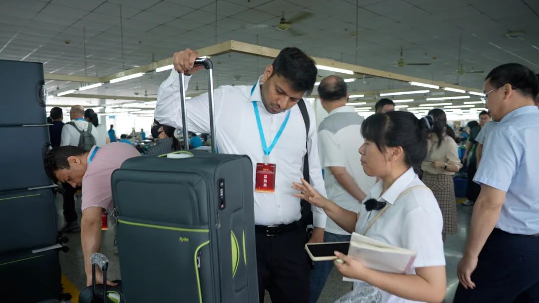 最早,當(dāng)?shù)刈龅氖遣剂喟梅b廠的邊角料拼的。如今,產(chǎn)品已從最初的手提包、布袋,升級為拉桿箱、背包等。有的帶水杯架,甚至還能自己稱重、有充電USB接口……
