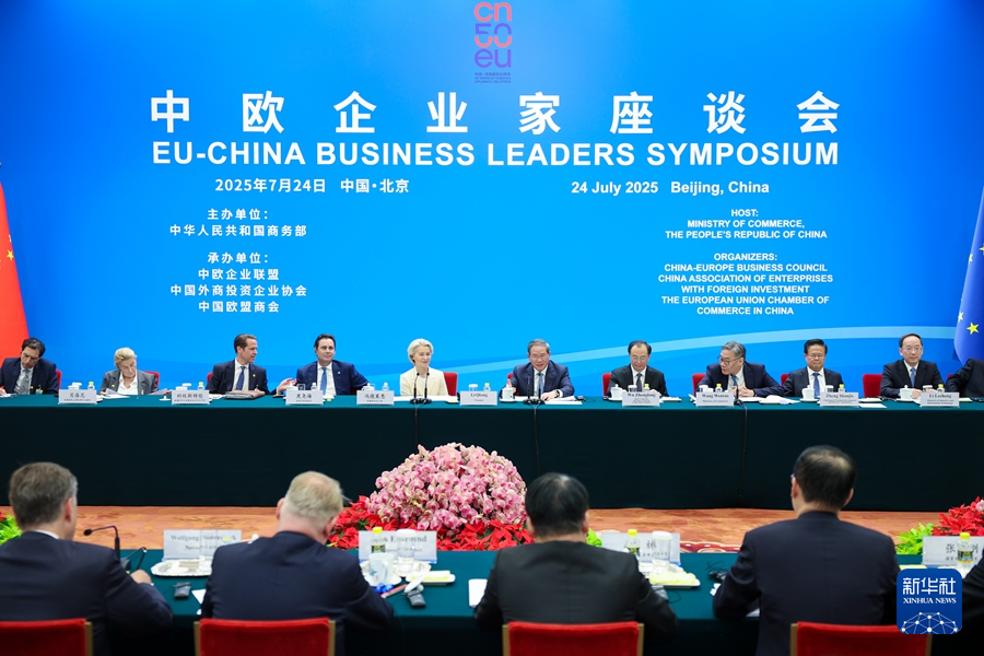 國務(wù)院總理李強7月24日下午在北京人民大會堂同歐盟委員會主席馮德萊恩共同出席中歐企業(yè)家座談會。近60位中歐商會和企業(yè)負(fù)責(zé)人出席。