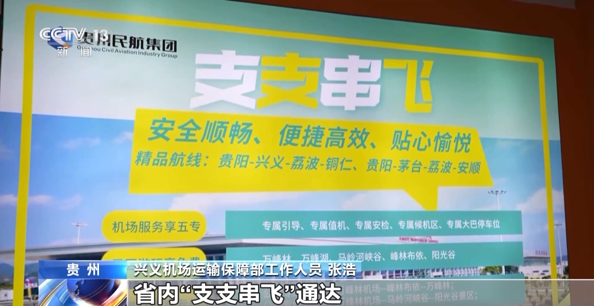 興義機(jī)場(chǎng)運(yùn)輸保障部工作人員 張浩:目前21條航線覆蓋21座城市,省內(nèi)“支支串飛”通達(dá)銅仁、荔波、遵義茅臺(tái)等航點(diǎn),興義到貴陽的“貴陽快線”保持每天3班執(zhí)飛。