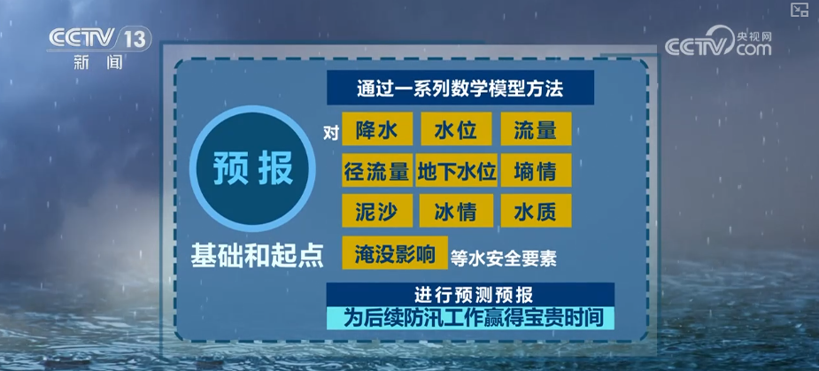 預報是基礎和起點,通過一系列數(shù)學模型方法,對降水、水位、流量、徑流量、地下水位、墑情、泥沙、冰情、水質、淹沒影響等水安全要素進行預測預報,為后續(xù)防汛工作贏得寶貴時間。