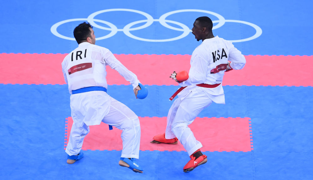 空手道作為“新增項目”之一進(jìn)入了東京奧運會,但未能在巴黎奧運會上繼續(xù)入圍。圖為東京奧運會,伊朗選手薩賈德(左)與沙特選手哈米迪在空手道比賽中。黃宗治 攝