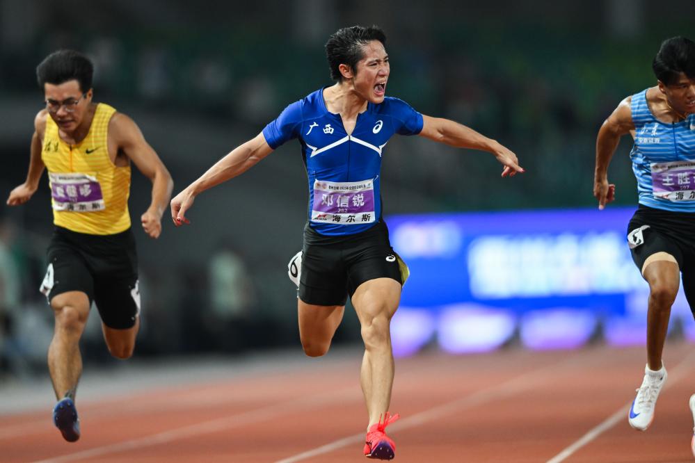 男子100米半決賽也進(jìn)行得異常激烈,名將謝震業(yè)因?yàn)樵谛〗M中排名第四,甚至沒能闖入決賽。兩小時(shí)之后的決賽中,半決賽排名第一的廣西隊(duì)選手鄧信銳以10秒06的個(gè)人最好成績奪冠,成為史上第七位突破10秒10的中國隊(duì)運(yùn)動員。