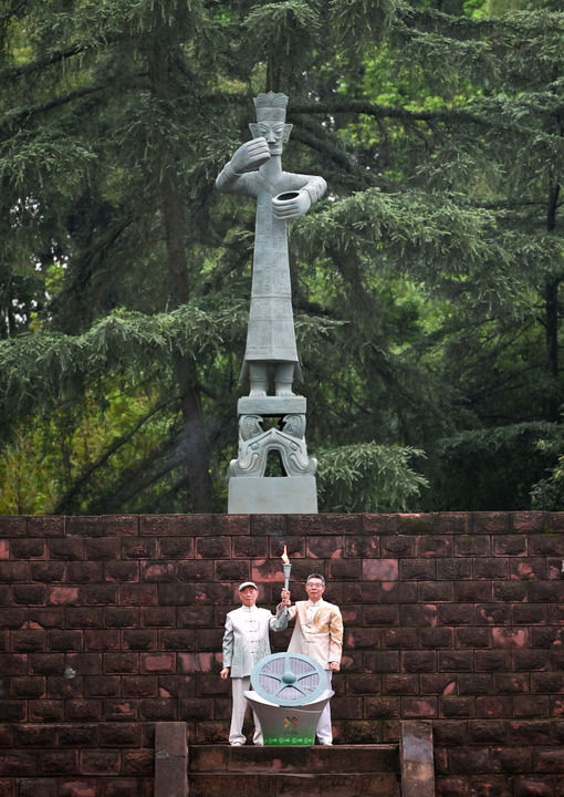2025年7月26日,三星堆博物館代表肖先進(左)、金沙遺址博物館代表朱章義在火種采集儀式上展示火種。當(dāng)日,第十二屆世界運動會火炬?zhèn)鬟f活動在四川舉行。