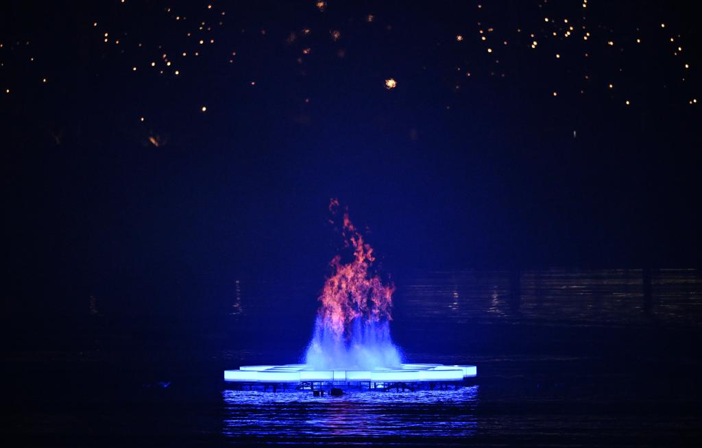 摩托艇靠近,點火——噴泉頂端,圣火熊熊燃起。