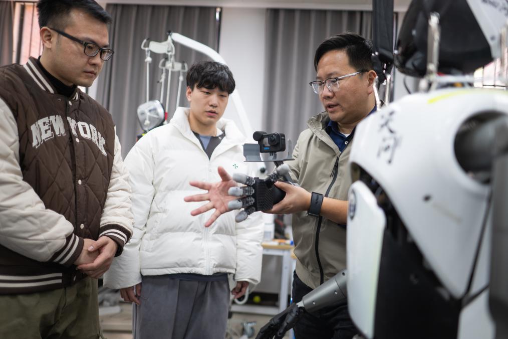 武漢大學研發(fā)團隊在對“天問”人形機器人進行調(diào)試。新華社記者肖藝九 攝