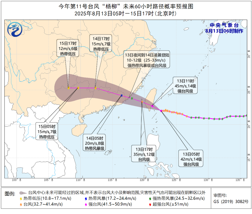 大風預報:8月13日08時至14日08時,東海南部、臺灣以東洋面、南海東北部、巴士海峽、臺灣海峽、臺灣島北部及其沿海、福建北部沿海、廣東中東部沿海將有6~8級大風,臺灣島南部及其沿海、福建中南部沿海、臺灣東南洋面、臺灣海峽和巴士海峽的部分海域風力可達9~10級,臺風中心經(jīng)過的附近海域和地區(qū)風力有11~14級,陣風15-16級。